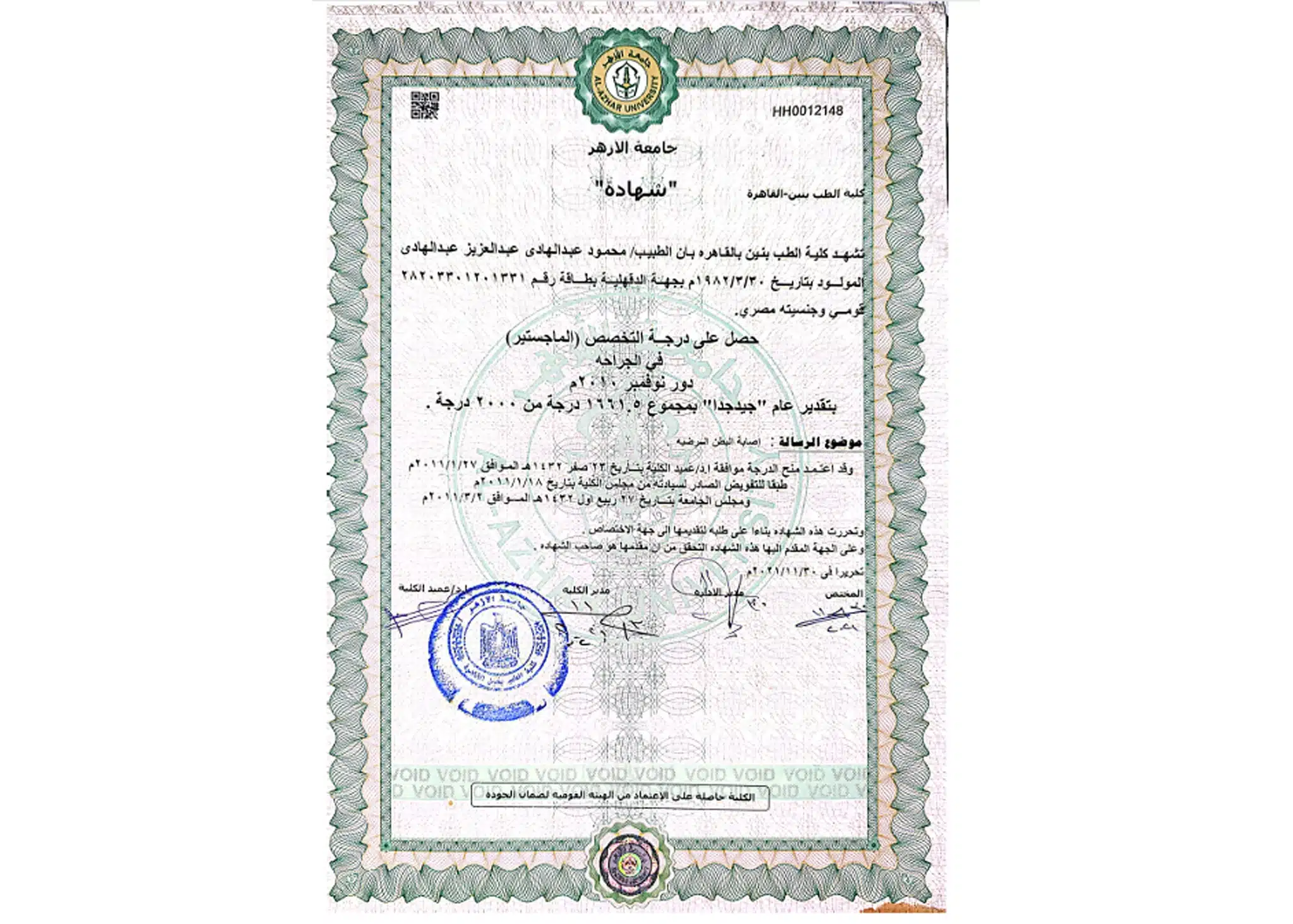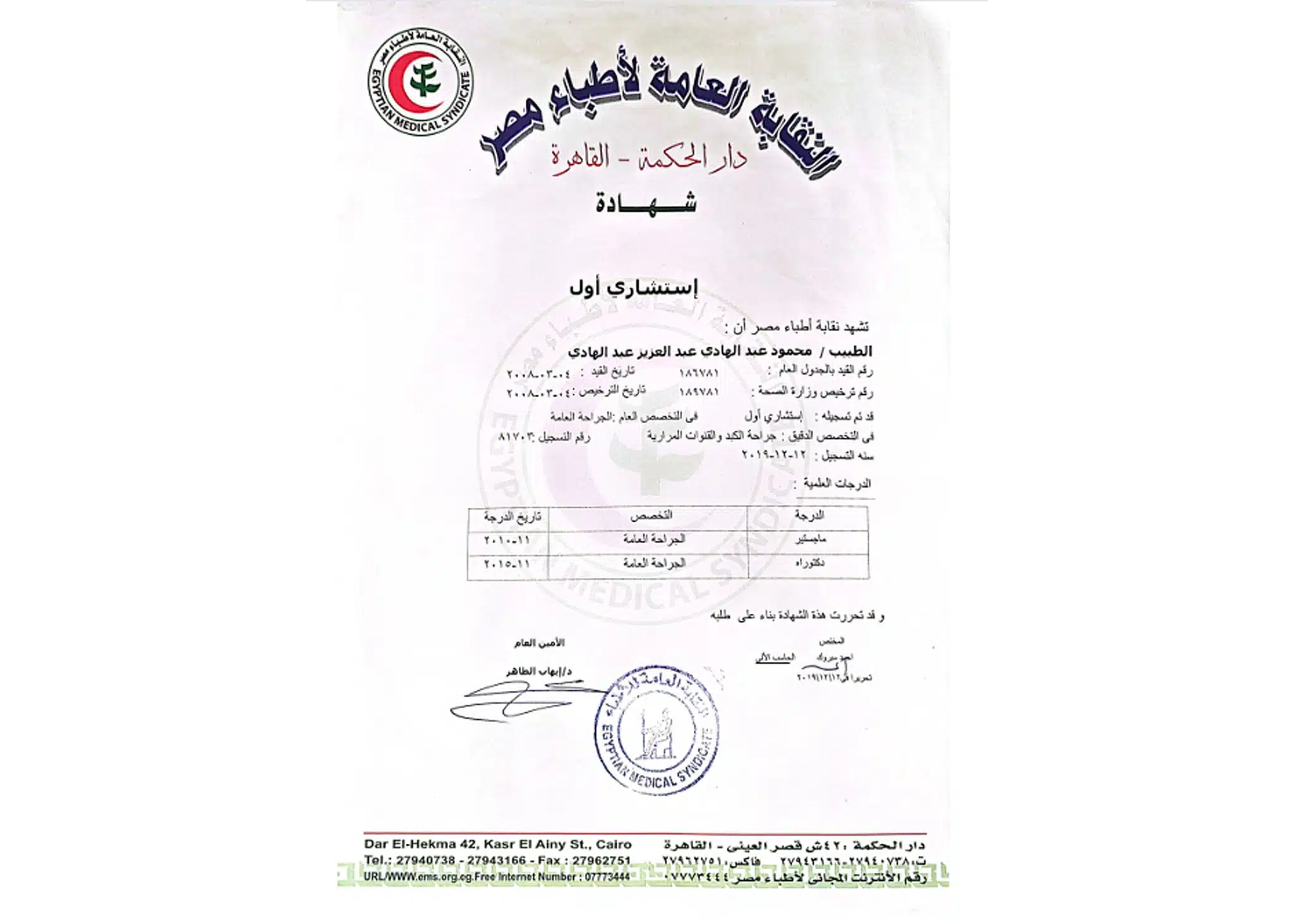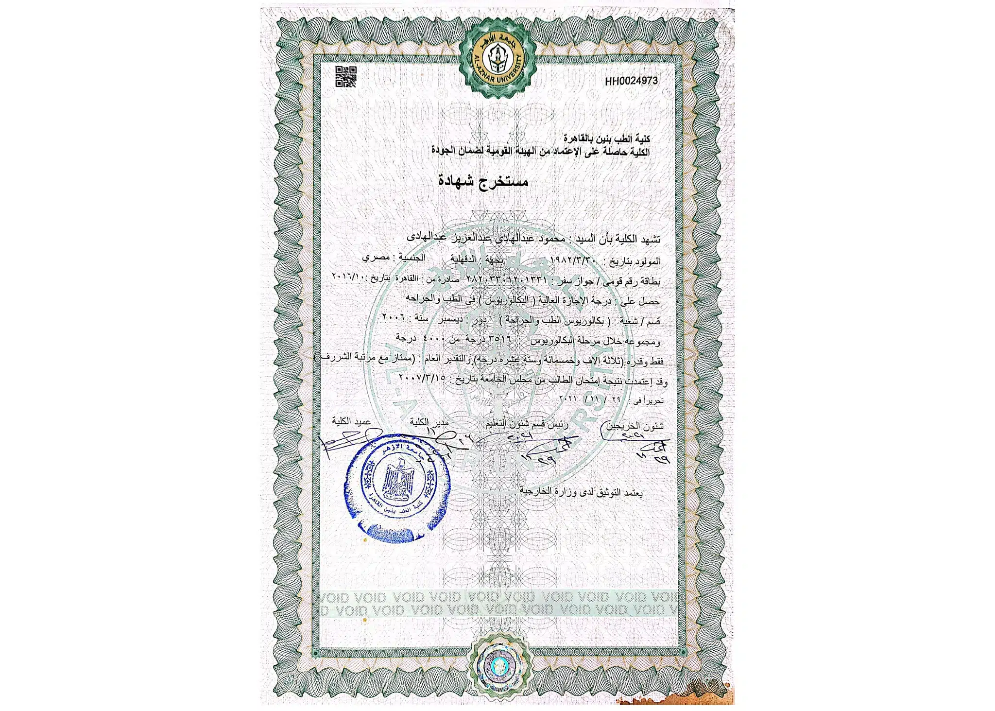 الشهادات والاعتمادات الشهادات اعتمادات تثبت خبرتنا نؤمن أن ثقة المريض تُبنى على أساس من العلم والاعتماد الرسمي. في عياد النجار الطبية نفخر بحصولنا على شهادات واعتمادات محلية ودولية تعكس التزامنا بأعلى معايير الجودة الطبية.