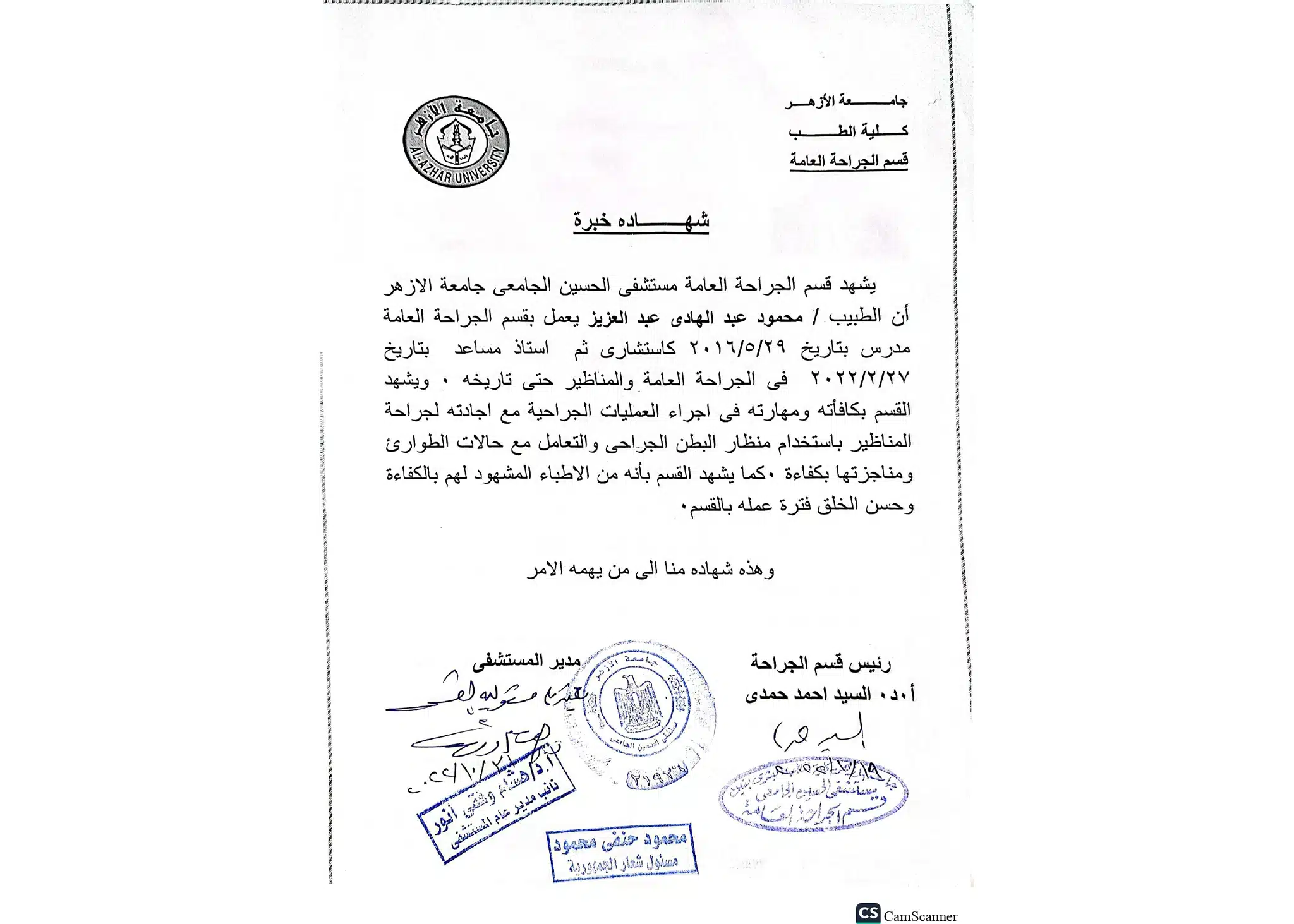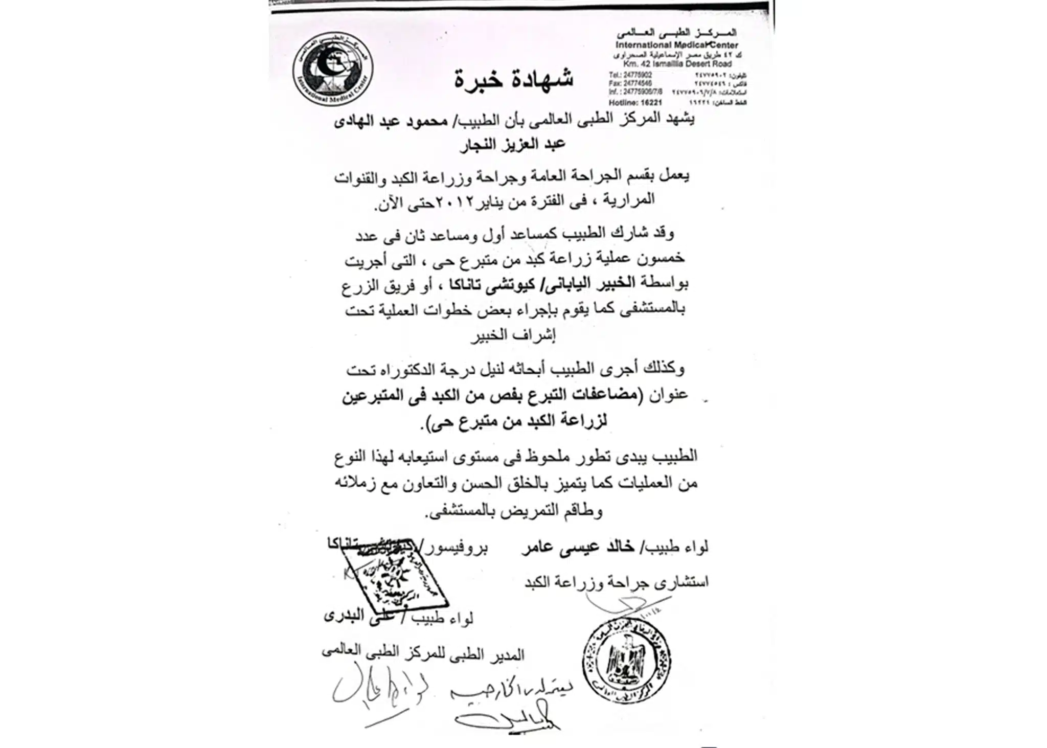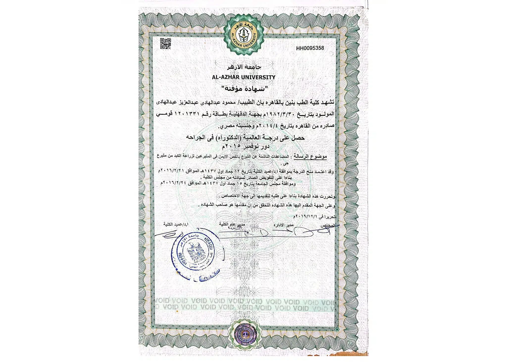 الشهادات والاعتمادات الشهادات اعتمادات تثبت خبرتنا نؤمن أن ثقة المريض تُبنى على أساس من العلم والاعتماد الرسمي. في عياد النجار الطبية نفخر بحصولنا على شهادات واعتمادات محلية ودولية تعكس التزامنا بأعلى معايير الجودة الطبية.